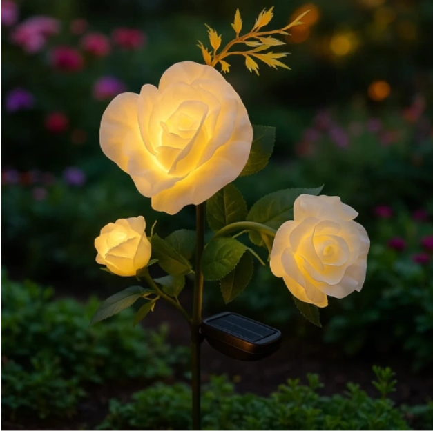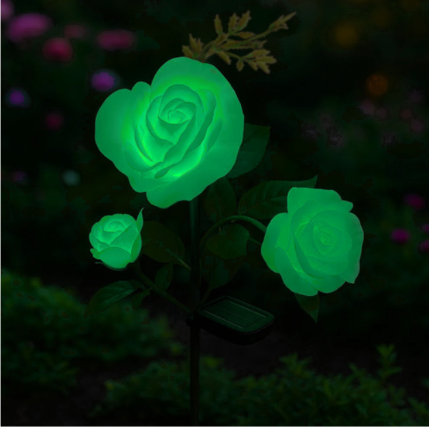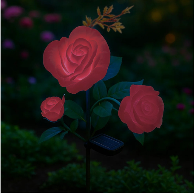 Aurinkokennolla toimiva LED-ruusulamppu puutarhaan – 3 kukkaa
