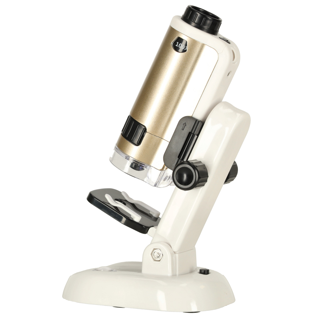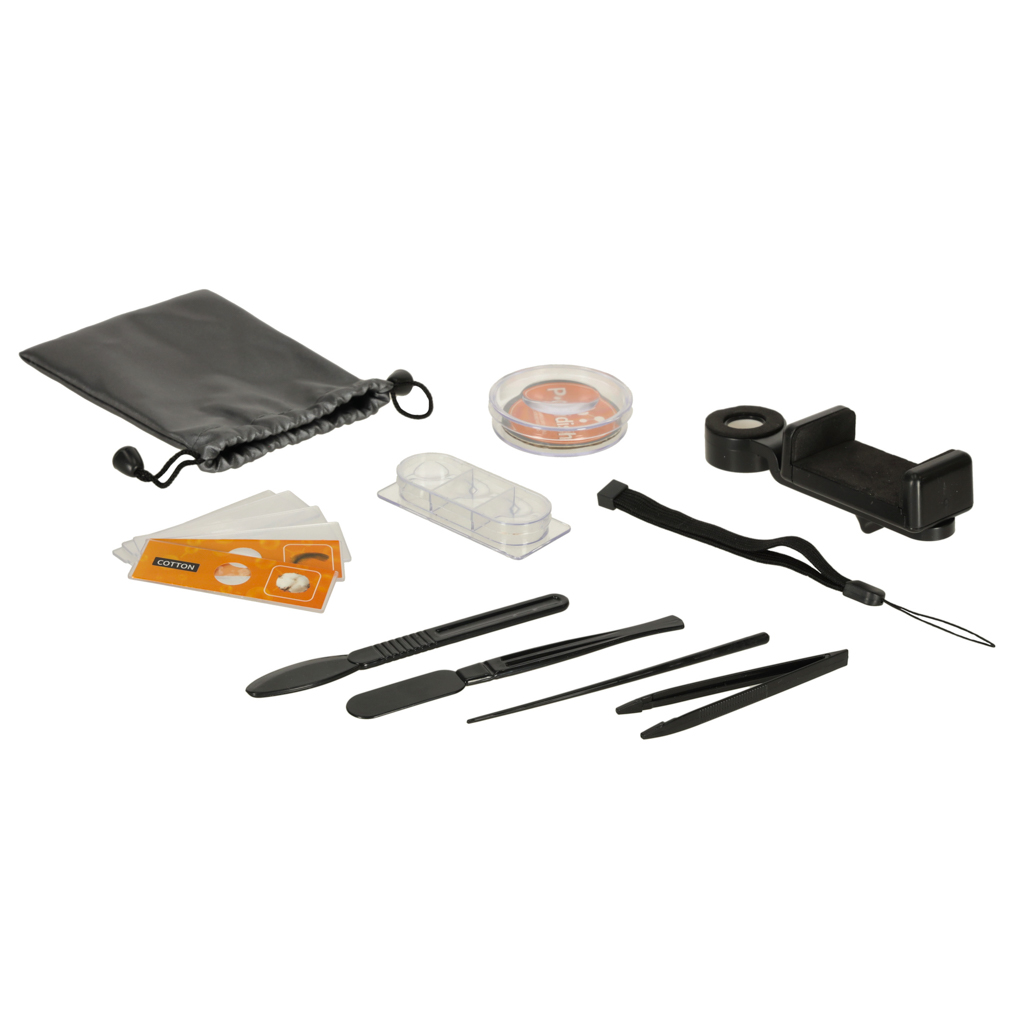 Mikroskoopissa on kaksi suurennustasoa (100x ja 250x), joiden avulla voi tarkastella erilaisten materiaalien rakennetta yksityiskohtaisesti. Mukana tulevan puhelinpidikkeen ansiosta näytteitä voi seurata myös puhelimen näytöltä ja tallentaa kuvia omista löydöistä.